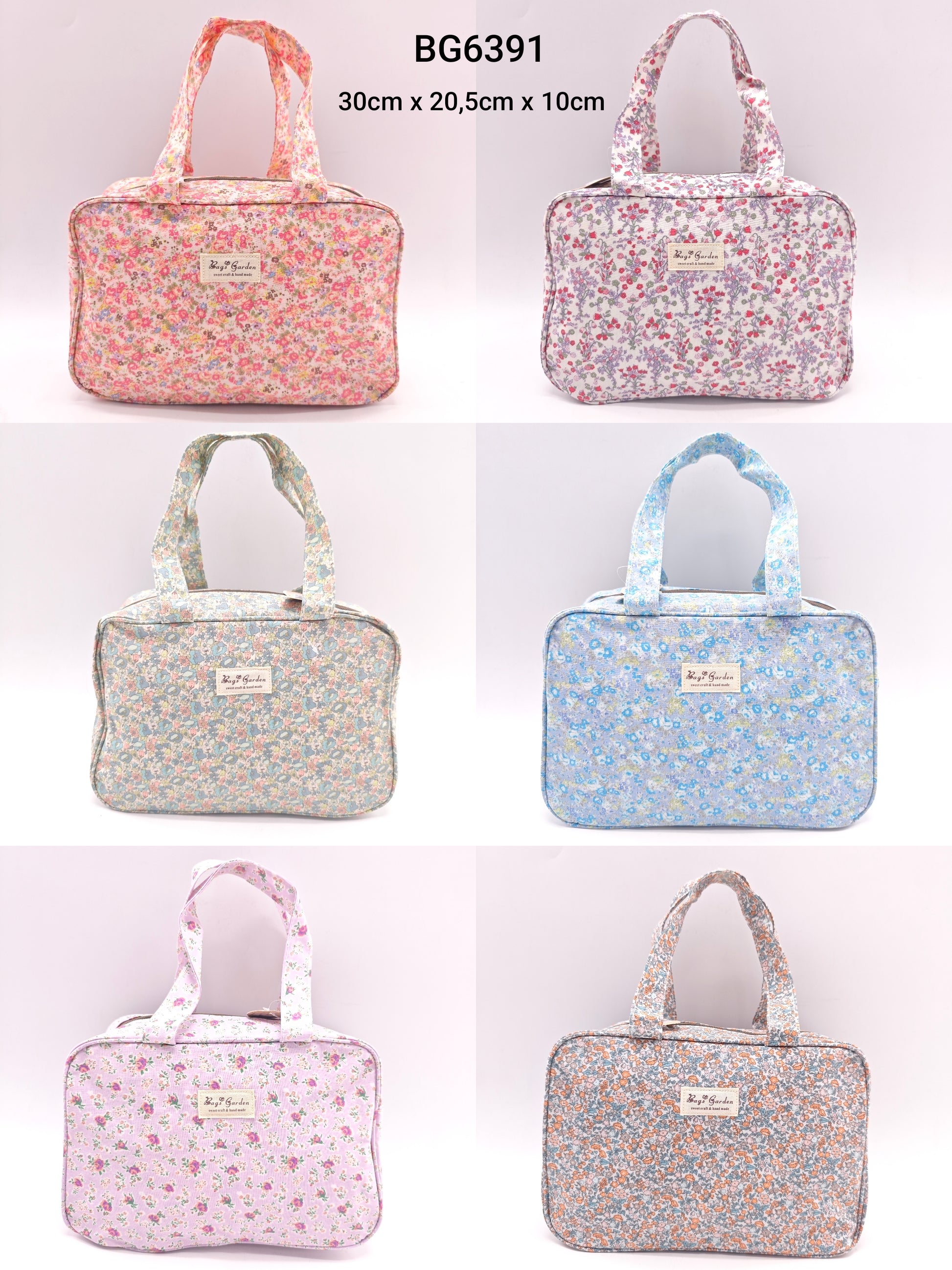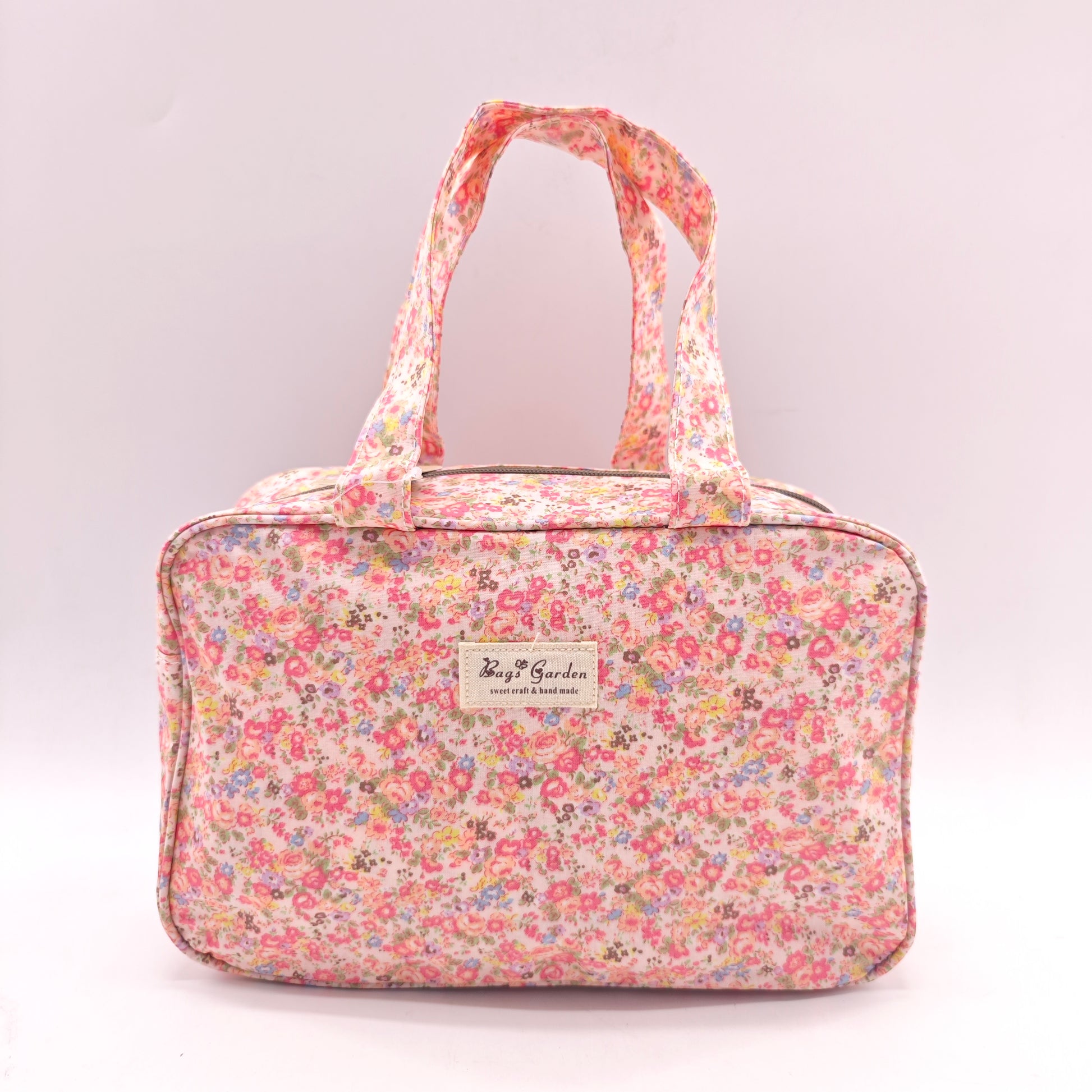 Compacto y versátil, este bolso de mano con estampado floral está confeccionado en algodón resinado impermeable, ideal para el uso diario.