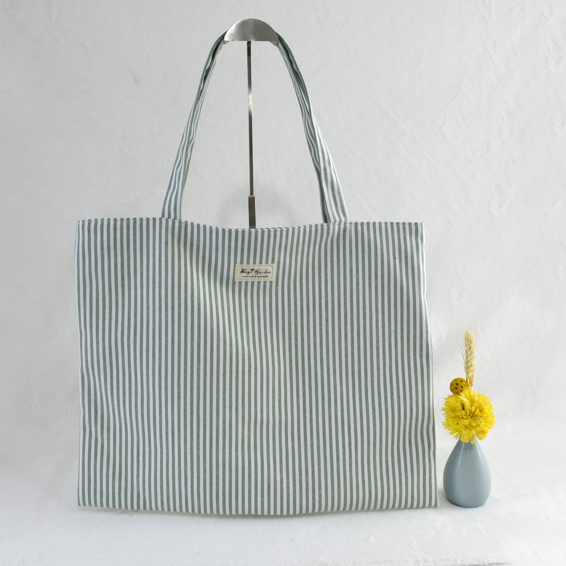 Un bolso tipo tote con diseño de rayas en tonos suaves, confeccionado en algodón, con interior forrado en tela lisa color crudo.