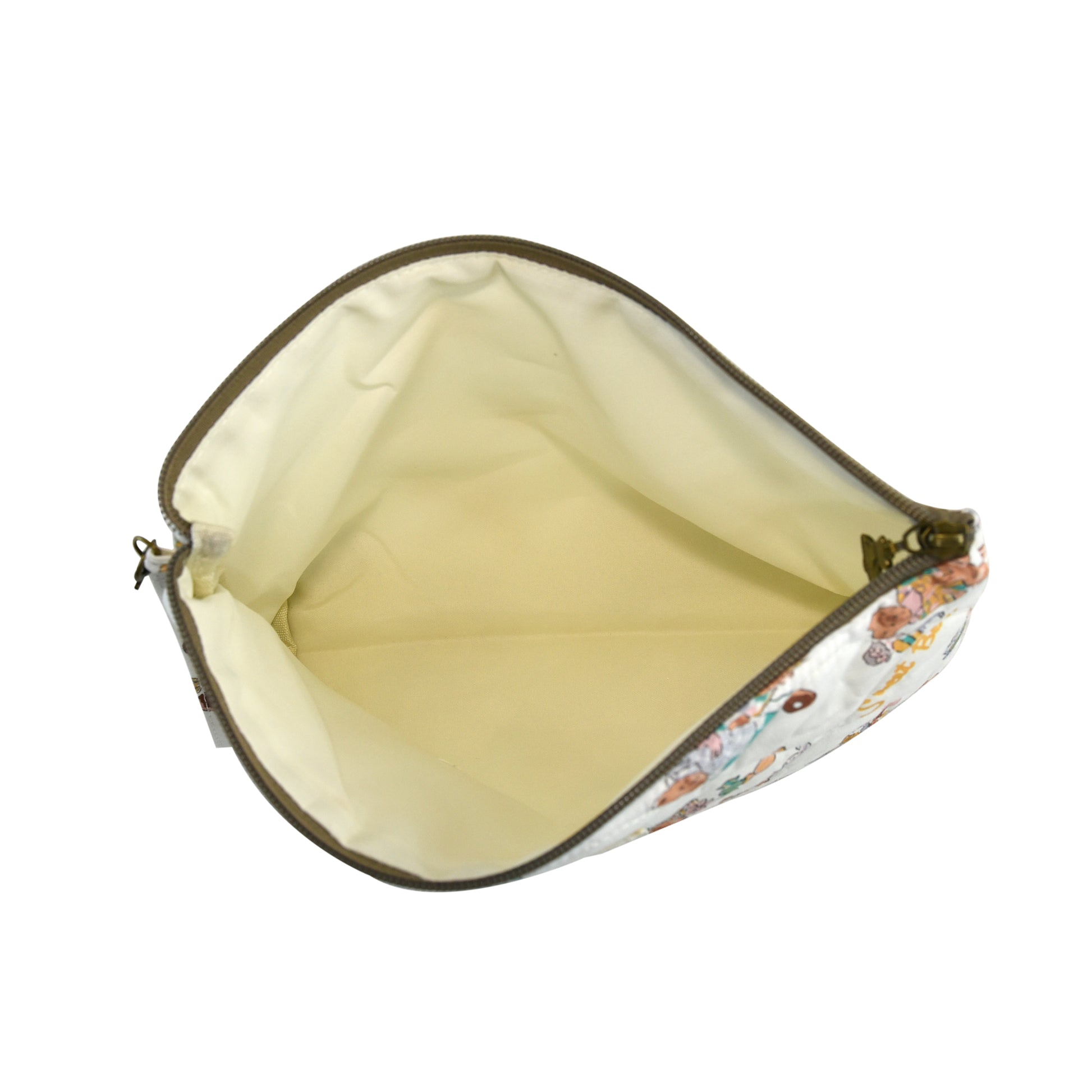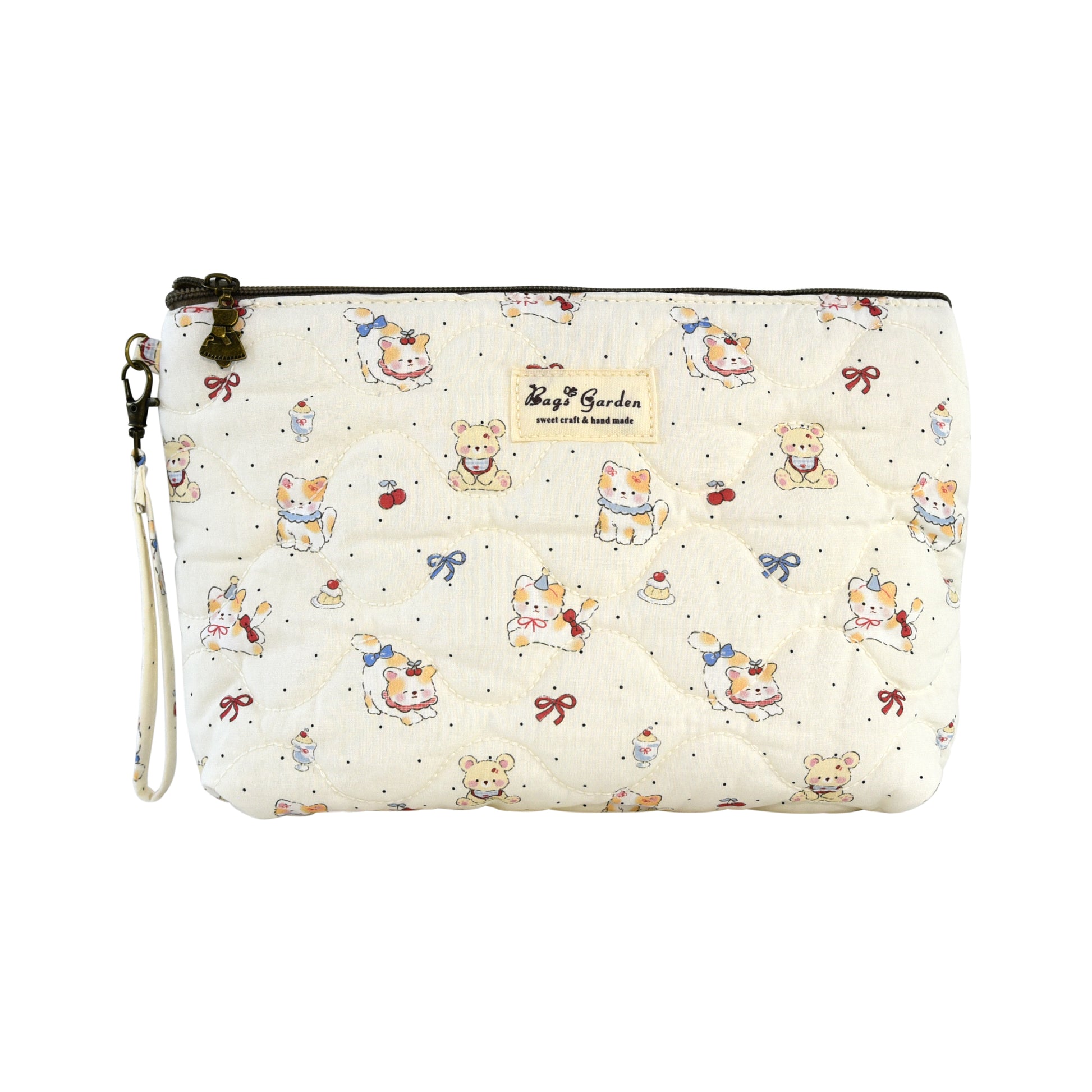 Neceser acolchado de algodón con el estampado Cartoon Friends, lleno de animalitos ilustrados con un estilo dulce y encantador. Ligero, suave y con interior amplio para organizar maquillaje, aseo diario o accesorios. Incluye muñequera desmontable y cierre con cremallera para mayor comodidad y seguridad. Perfecto para usar en viajes o llevar en el bolso durante el día.