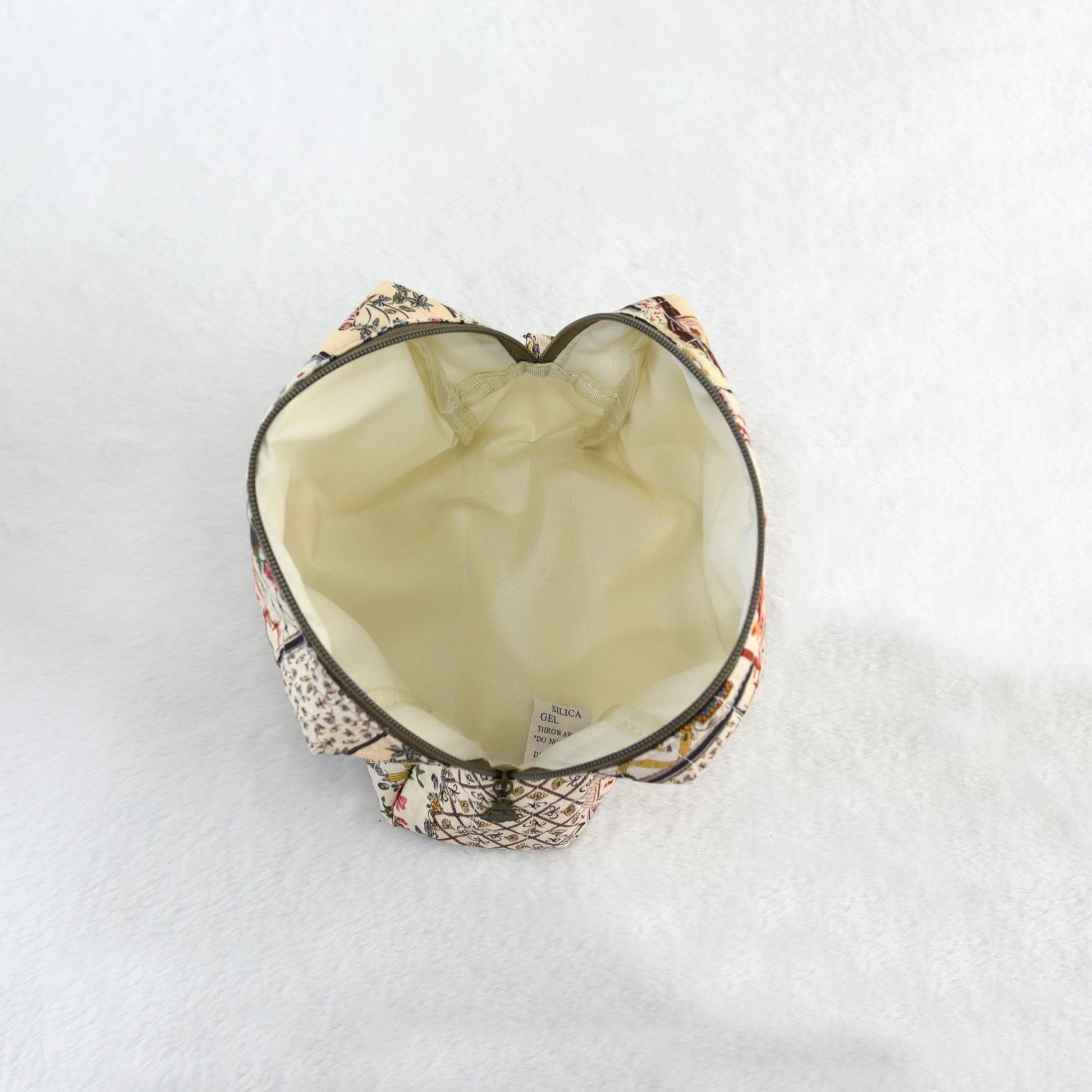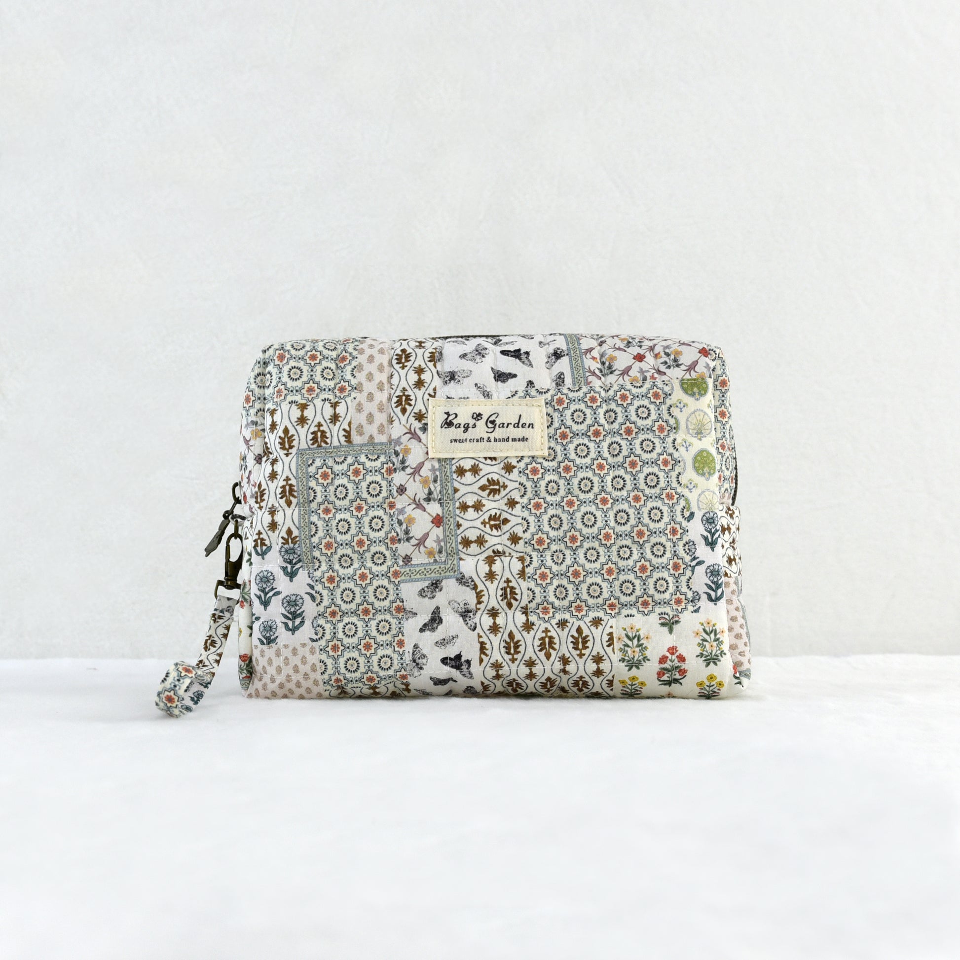 Este neceser de algodón con diseño patchwork floral combina un encanto vintage con la practicidad del día a día.